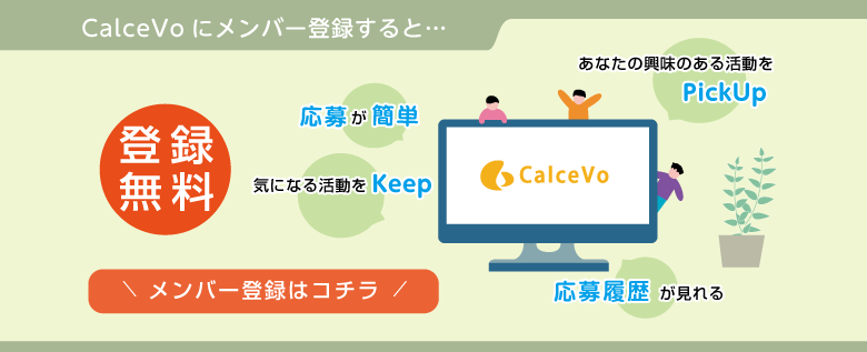 CalceVoメンバーになると、あなたが興味を持っている分野や、対象地域の活動がPickUpされ、 たくさんのボランティア活動の中から、参加したい活動を見つけやすくなります。